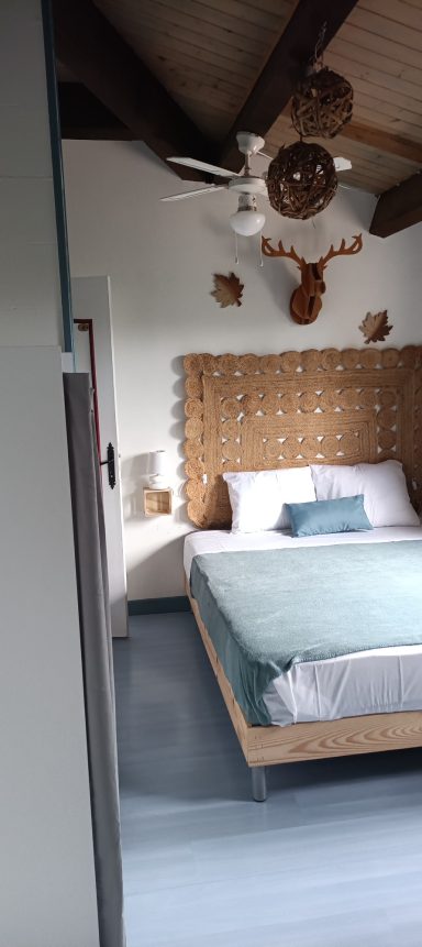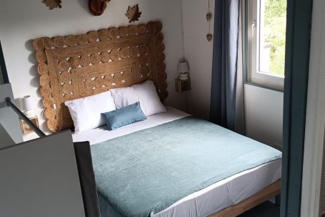 La chambre Dryades vous offre un confort avec sa chambre 2 personnes, équipée d'un lit de 160 cm. Profitez d'un moment de détente dans cet espace intime, doté d'un WC indépendant et d'une vue sur la nature environnante. Cette harmonie entre confort moderne et paysages sereins en fait le lieu idéal pour une escapade romantique ou un séjour reposant.