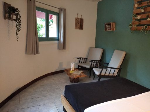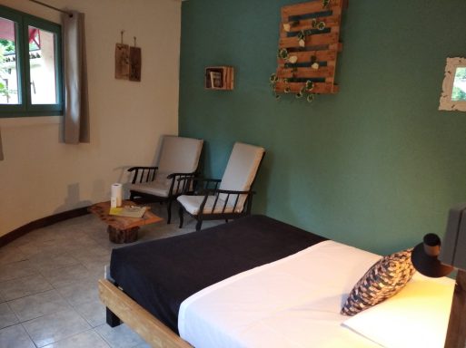 La chambre Fuschia est idéale pour les familles avec une capacité d’accueil de 2 à 4 personnes. Elle est équipée d’un vaste lit de 160 cm, ainsi que d’un lit gigogne pour plus de confort. Vous pourrez profiter d'une vue apaisante sur la piscine et le jardin, créant ainsi un cadre parfait pour vos moments de détente en famille.