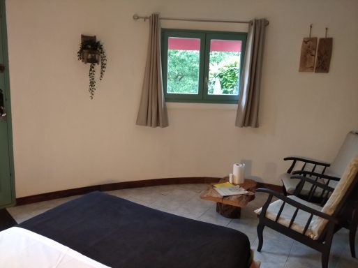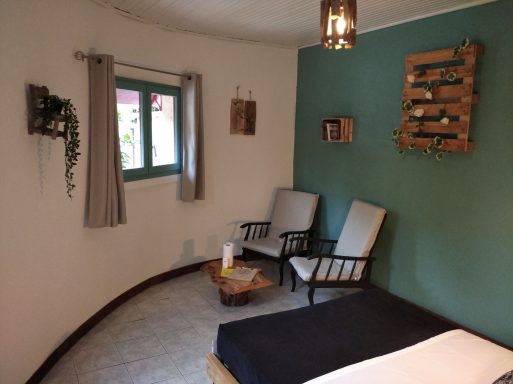 La Chambre Rotonde, avec sa décoration naturelle et chaleureuse, offre un espace idéal pour deux personnes. Dotée d'un grand lit de 160 cm, elle garantit un confort optimal pour des nuits reposantes. Son accès indépendant permet une discrétion totale, idéale pour ceux qui recherchent une escapade tranquille. Plongez dans une atmosphère apaisante, où la nature s'invite à l'intérieur, faisant de votre séjour une expérience unique et ressource. Terrasse privative.