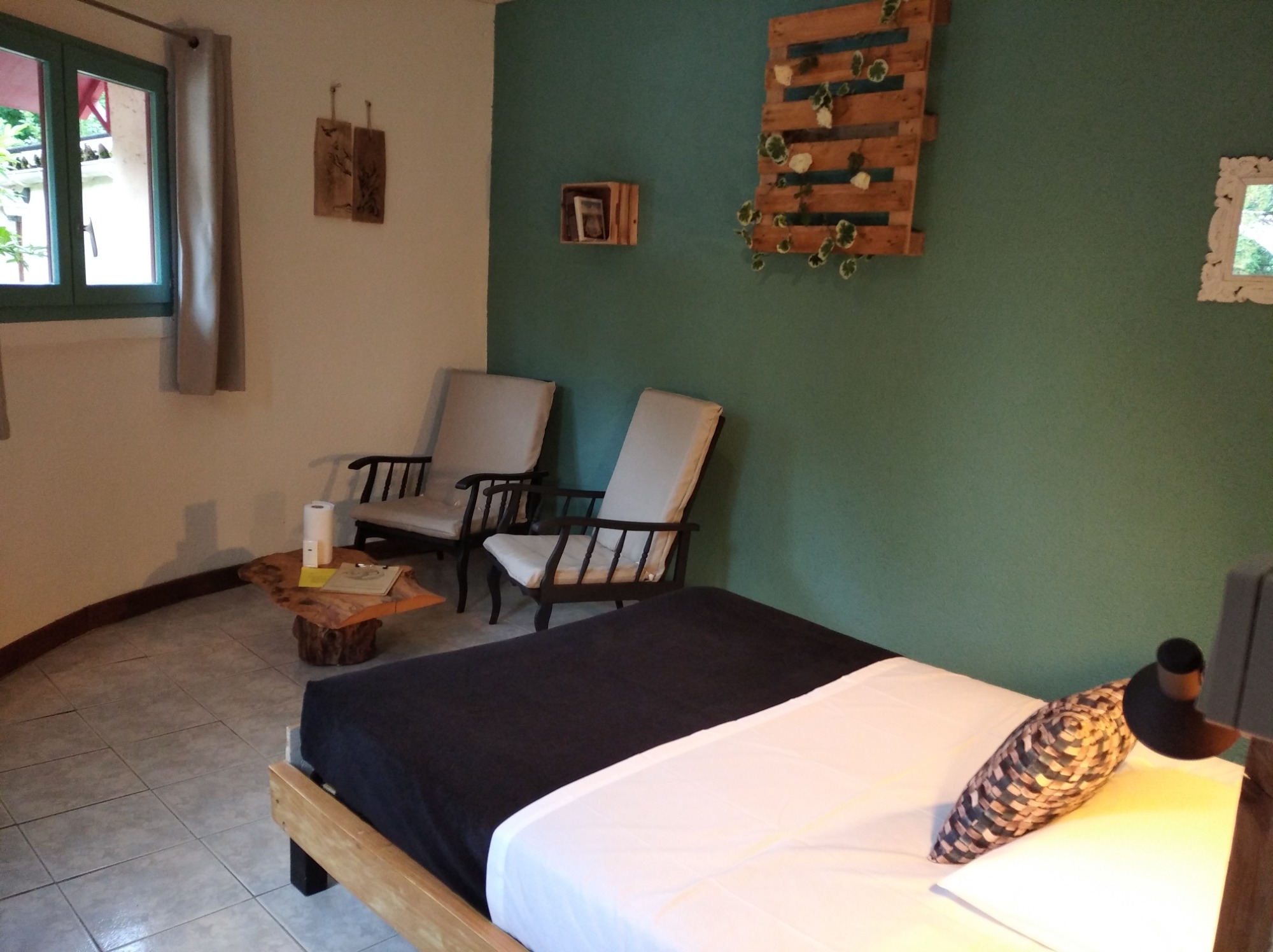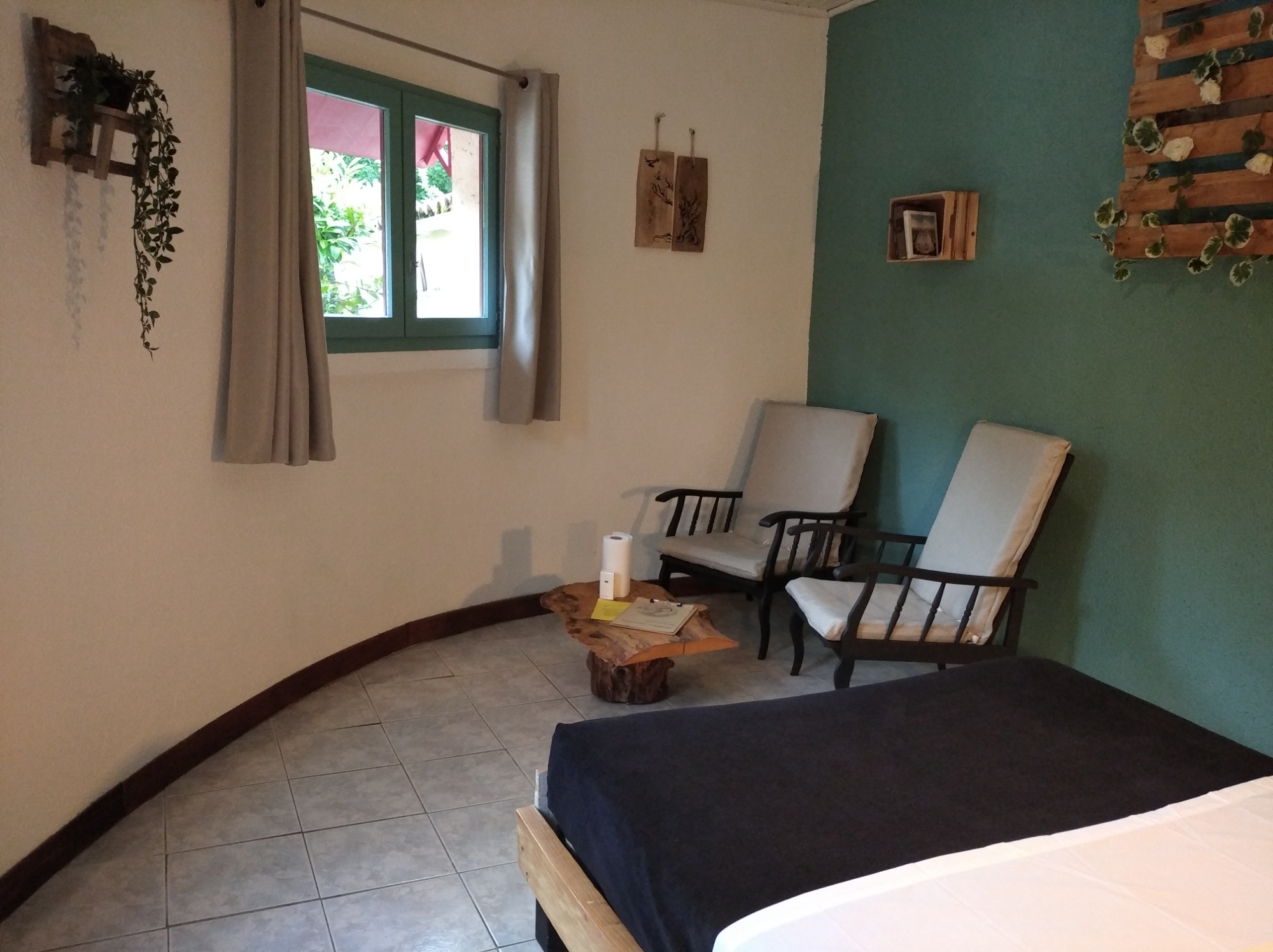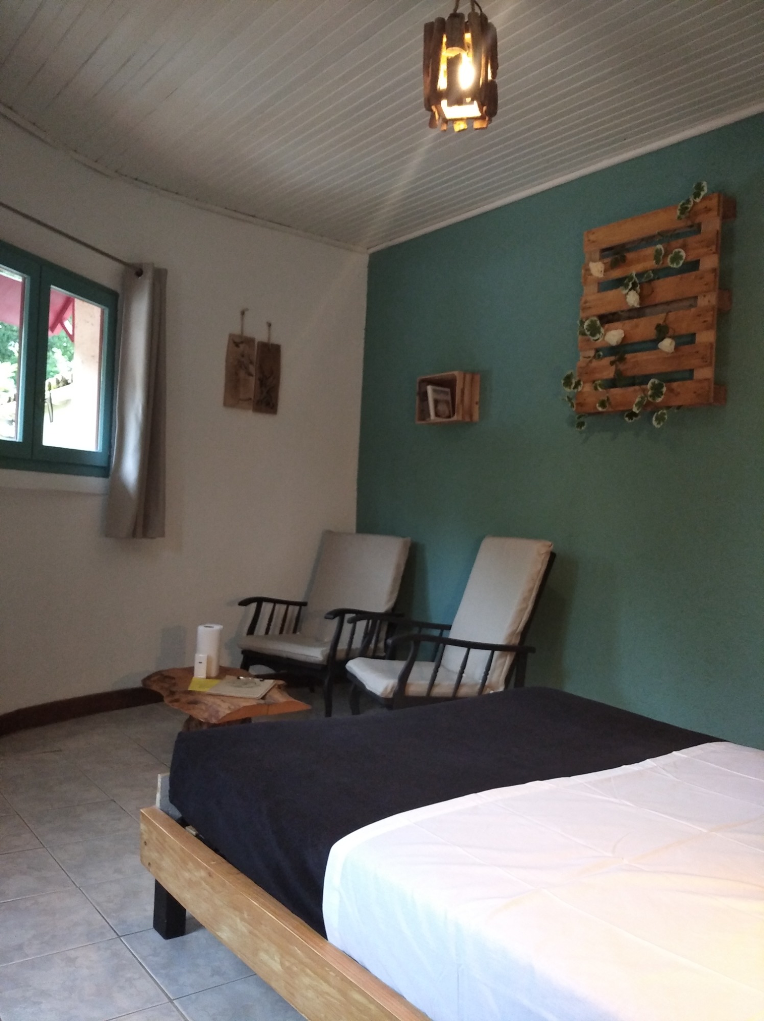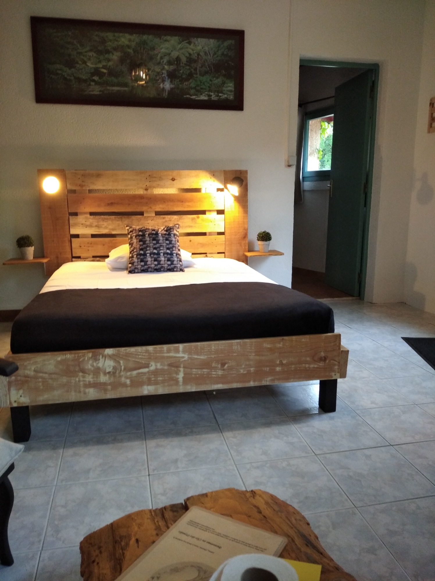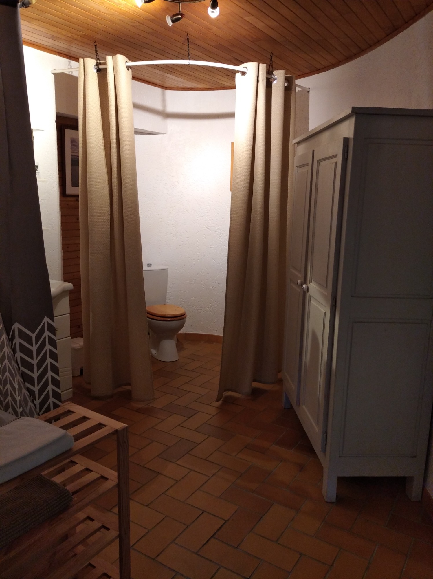 La Chambre Rotonde, avec sa décoration naturelle et chaleureuse, offre un espace idéal pour deux personnes. Dotée d'un grand lit de 160 cm, elle garantit un confort optimal pour des nuits reposantes. Son accès indépendant permet une discrétion totale, idéale pour ceux qui recherchent une escapade tranquille. Plongez dans une atmosphère apaisante, où la nature s'invite à l'intérieur, faisant de votre séjour une expérience unique et ressource. Terrasse privative.