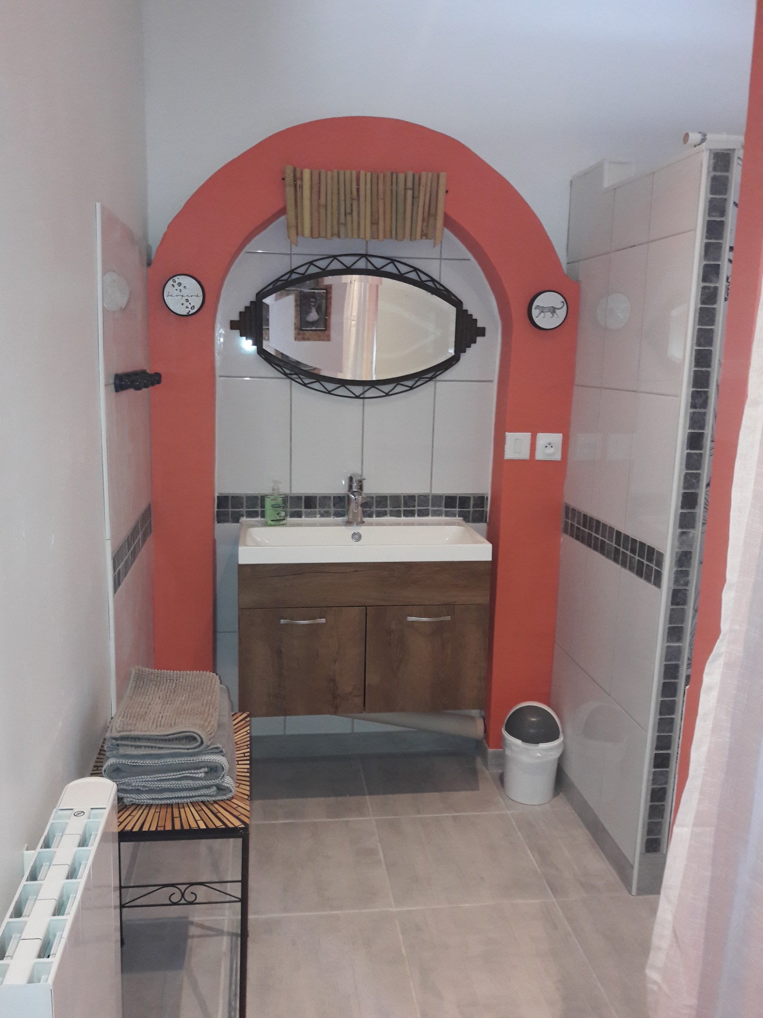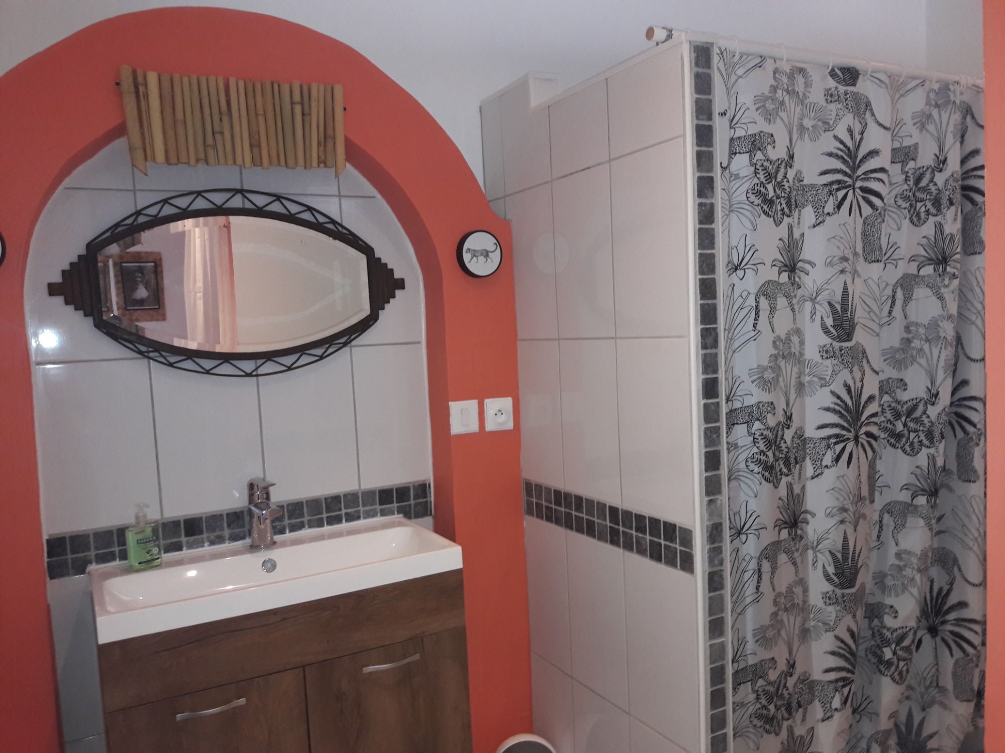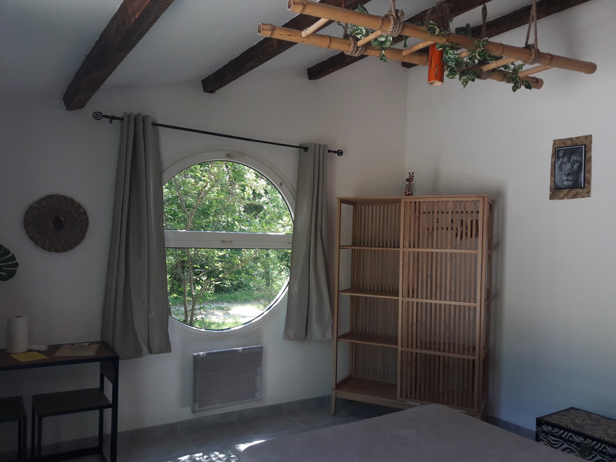 La chambre "Savane" vous invite à découvrir un espace unique avec sa grande fenêtre en forme de hublot, offrant une vue imprenable sur les bois environnants. Ce design original crée une atmosphère apaisante, évoquant les vastes horizons de la savane. La chambre est équipée d'une douche à l'italienne moderne, vous permettant de profiter d'un moment de détente après une journée d'exploration.Elle est idéale pour 2 à 3 personnes, offrant un lit de 160 cm et un coin nuit confortable avec un lit de 90 cm. Cette chambre spacieuse dispose également d'une terrasse privative, permettant à ses occupants de profiter d'un accès indépendant et d'un espace extérieur paisible pour se détendre. La combinaison de confort et d'intimité en fait un choix parfait pour un séjour relaxant.