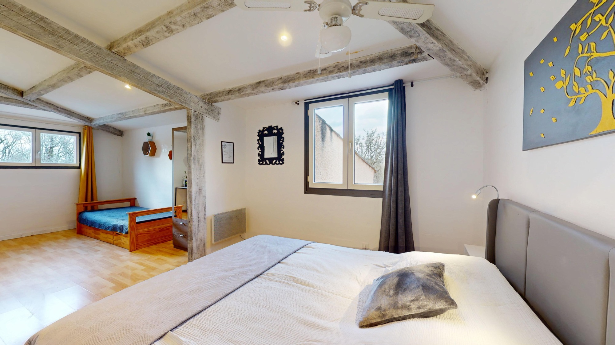 La chambre Grise est parfaite pour accueillir une famille de 2 à 4 personnes. Avec un lit confortable de 160 cm et un lit gigogne, elle offre un espace chaleureux et convivial. Cette configuration permet aux parents de se reposer tout en offrant à leurs enfants un espace confortable pour dormir. Vous pourrez profiter d'une vue magnifique sur la piscine et le jardin, créant ainsi une atmosphère relaxante et sereine. Votre séjour dans cette chambre sera une expérience inoubliable, alliant confort et beauté naturelle. Décorée avec des touches modernes et chaleureuses, la chambre "Grise" crée une atmosphère apaisante, parfaite pour se ressourcer après une journée bien remplie. Que ce soit pour une escapade en famille ou un simple séjour, cette chambre saura répondre à tous vos besoins.